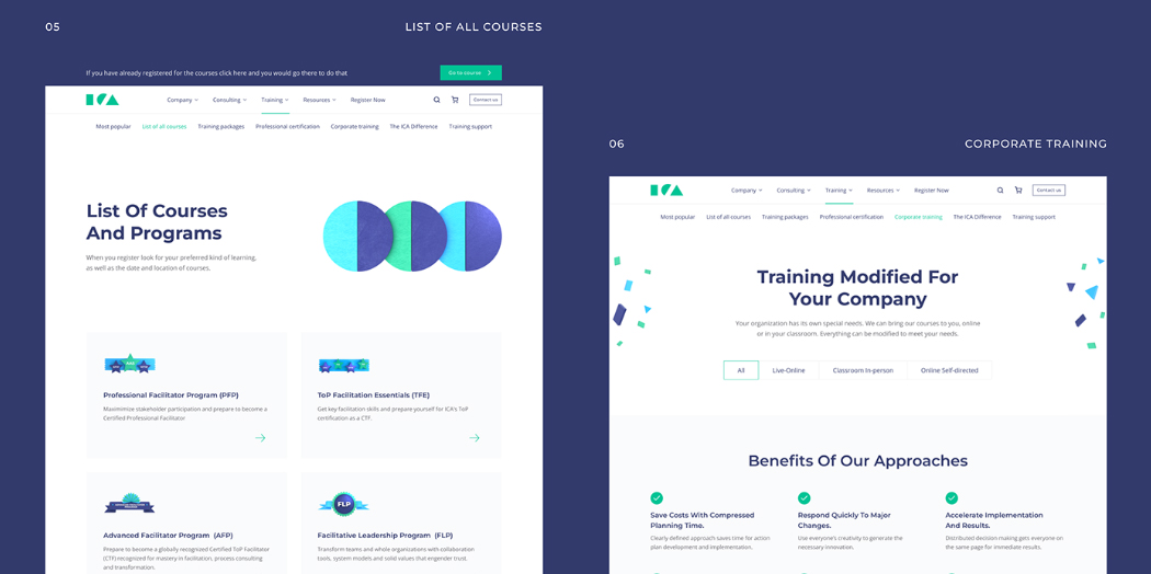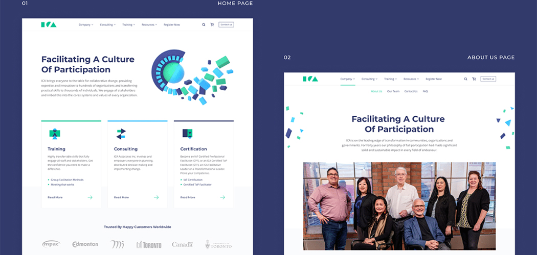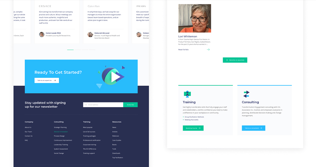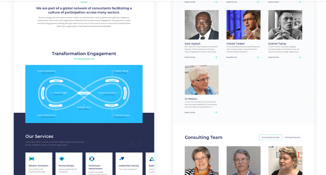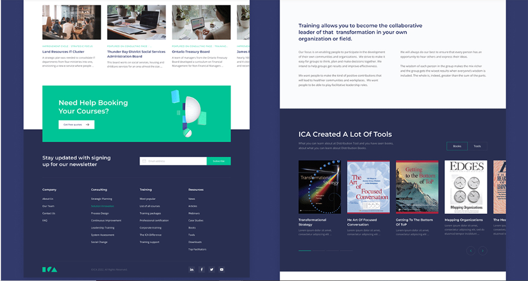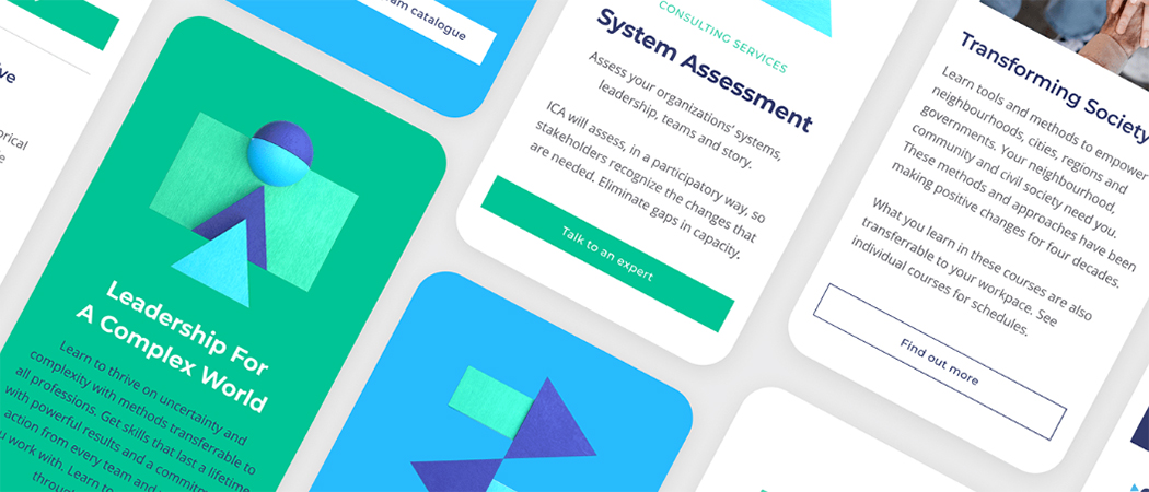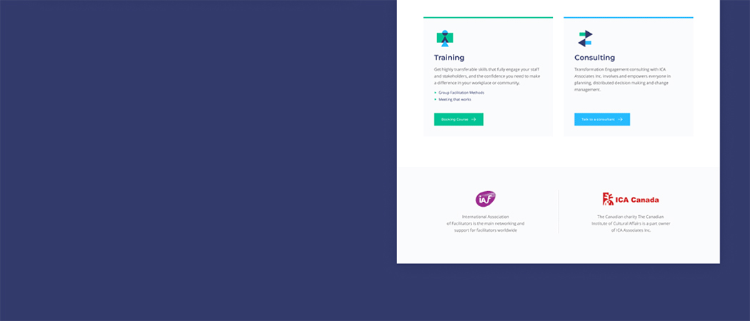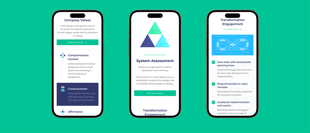 Нова версія сайту: оновлений вебсайт ICA Associates Inc. є адаптивним, зручним для мобільних пристроїв, з інтуїтивною навігацією, яка завжди під рукою. Компанія ICAA має два напрями діяльності: навчання (із широким вибором курсів) та консалтинг. Ми розробили окремі дизайни для кожного з цих напрямів, а також створили перелік курсів із можливістю онлайн-придбання. Команда ICAA розробила багато інструментів і книг, які здобули міжнародне визнання. Ми додали цю інформацію на новий сайт і зробили на ній акцент. Під час розробки сайту ми дотримувалися принципів інклюзивного дизайну.