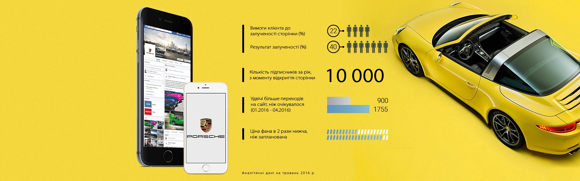 Менш ніж за рік нам вдалося зібрати більше 10 000 палких шанувальників Porsche, і ця цифра невпинно зростає. Завдяки правильно налаштованим таргетингам ми сформували цільову аудиторію, яка позитивно сприймає контент сторінки. Про це свідчать високі рівні залучення й охоплення, що перевищують заплановані показники удвічі.