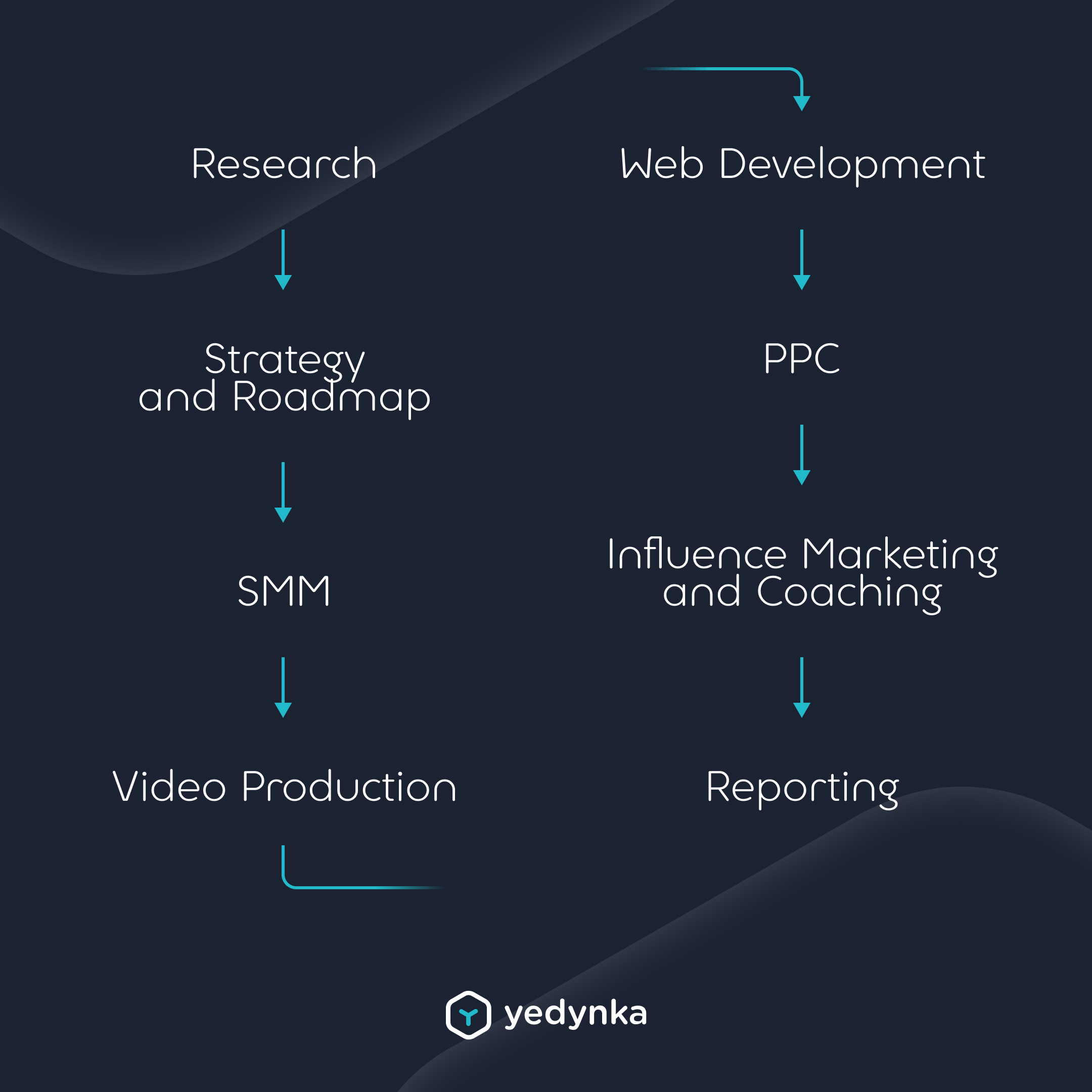 Research → Strategy and Roadmap → SMM → Video Production → Web Development → PPC → Influence Marketing and Coaching → Reporting
